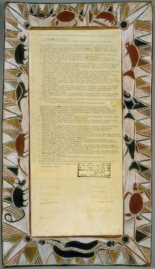 The Bark Petition (a petition framed by painted bark) was presented to federal parliament in August that year.