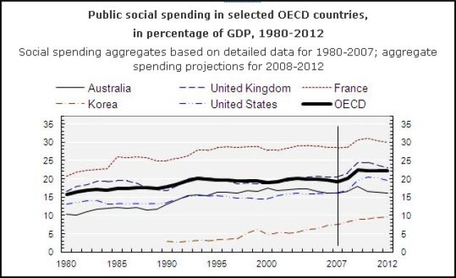 At 16% of GDP, public social spending in Australia is lower than the developed (OECD) country average of 19.2%. It lags behind 25 other countries. Even the US is ahead at 16.1%.