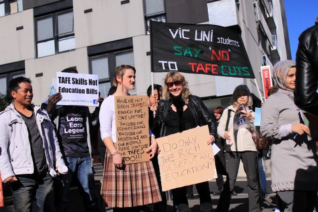 The rally against the TAFE cuts was organised by RMIT TAFE students. Protesters from several TAFE institutions in Melbourne met at the RMIT Carlton TAFE campus where speakers denounced the consequences of the Victorian government funding slash.