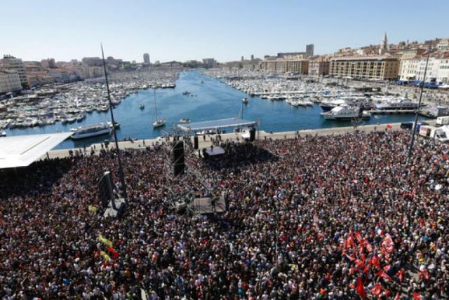 With an olive branch in his jacket's buttonhole, he began with a a one-minute silence for the 30,000 asylum-seekers who died in the nearby Mediterranean sea. He insisted: "If you want peace, don't make a mistake with your ballot," said the candidate — who split with the Socialist Party in 2008 to found the Left Party. Last year, Melenchon launched a broader movement known as "Unsubmissive France" that calls for a constituent assembly to draft a enw constitution for a new "Sixth Republic".