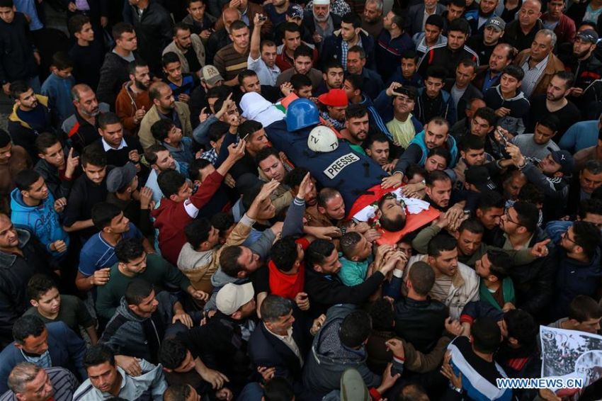The fatal injury of journalist Ahmad Abu Hussein, who was wearing protective gear identifying him as a member of the press when he was shot on April 13, was likewise documented on video.