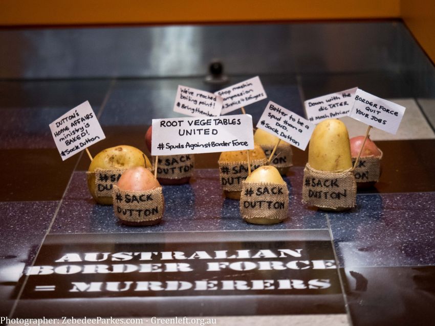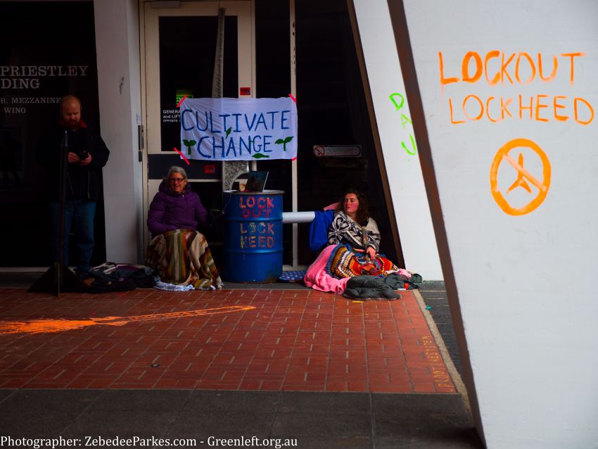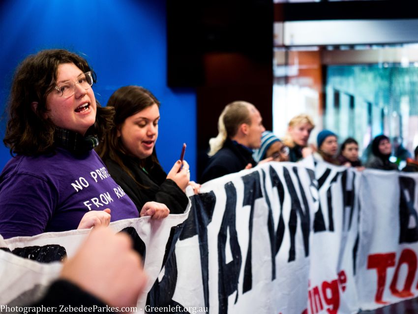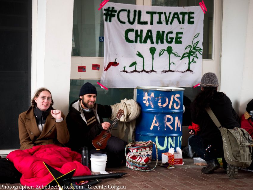 Under the banner #UprootTheSystem students and activists, as part of the Students of Sustainability conference, staged actions in the early hours of Wednesday 11 July to protest corporate, government and university complicity in the cycle of war, climate destruction and abuse of refugees.