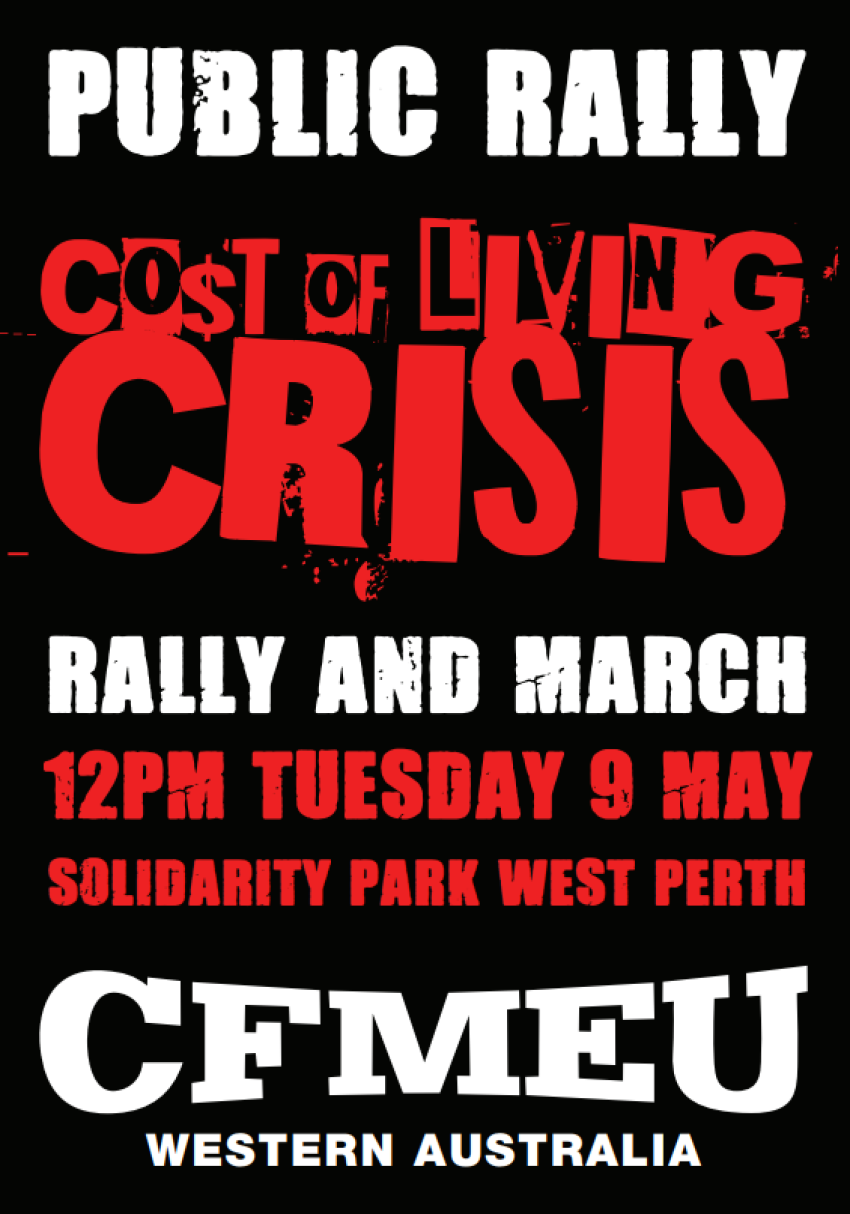 Join the CFMEU for a public rally march to the Reserve Bank to protest the its decision to again lift interest rates and the soaring cost of living for West Australian workers and our families.