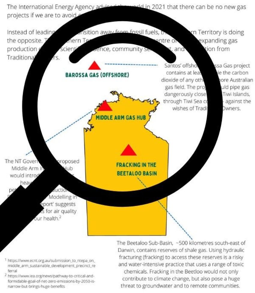 Gawen said the Middle Arm development is an industrial hub on Darwin Harbour being pushed by NT Labor. “Two LNG facilities already exist there, but the plans would lead to the clearing of another 1500 hectares for the construction of fossil fuel industries, including the processing plant of company Tamboran for its fracked Beetaloo gas.”