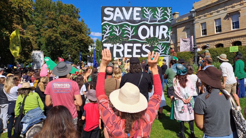 Speakers at the “March for the Forests” included Pakana woman Theresa Sainty, Jenny Weber from Bob Brown Foundation, Alice Hardinge from the Wilderness Society, Palawa writer and activist Jim Everett, forest defender Colette Harmsen and Bob Brown.