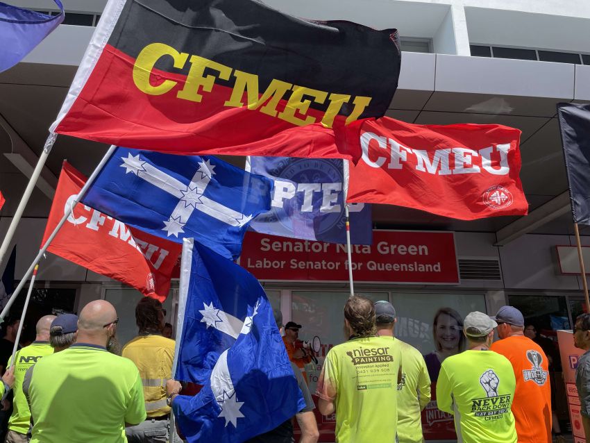 Jacob Andrewartha reports from Naarm/Melbourne that that most came from the Building Industry Group of Unions (BIG), which includes the CFMEU, Electrical Trades Union (ETU), Australian Manufacturing Workers Union and the Communications, Electrical and Plumbing Union of Australia. Most of these workers had walked off the job.