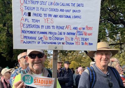 Thousands rallied on Parliament House lawns to oppose the Liberal government’s plans to proceed with a new Australian Football League and AFL Women’s stadium at Macquarie Point. Philippa Skinner reports.