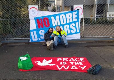 Two peace activists, Greg Rolles and Shane Anderson, locked themselves to Lockheed Martin's main gates on August 11, blocking the entrance to the Dandenong research facility in an attempt to disrupt the making of missiles for military drones.