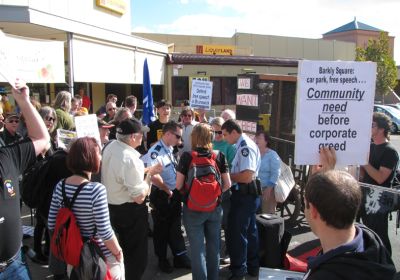 On May 8, 70 people from local groups joined with Socialist Alliance to march through Brunswick’s Barkly Square shopping centre, demanding management allow community stalls, including those held by the Socialist Alliance, to resume. Protesters had a replica of the original cage that radical artist and Communist Party of Australia member Noel Counihan spoke from in the 1933 free speech battles in Brunswick. A speak-out was held in the shopping centre, defying police and security guards.