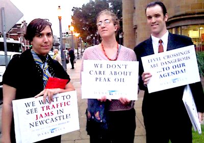Community group Save Our Rail held a lively picket outside a 700-strong meeting of the anti-rail lobby Fix Our City (FOC) at Newcastle Town Hall on June 3. FOC is a business and developer lobby group whose explicit aim is to have the Hunter Development Corporation (HDC) “urban renewal report” implemented. The HDC report’s main proposal is to cut the Newcastle at Wickham station. Save Our Rail drew 150 people to the counter-rally. It had the support of the Rail Tram and Bus Union, which brought several large union banners. -