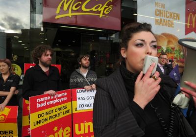 The first McDonald's strike ever in Wellington took place on May 22. At 8am, five of the seven workers on shift came off the job and joined the picket line that had been set up outside Bunny St McDonald's. It was a noisy, lively affair, with Fightback member and Wellington Unite union organiser Heleyni Pratley leading the way with chants, songs and the occasional speech to the people passing by. Pratley explained why the strike was being held and why the public needed to respect the picket line.