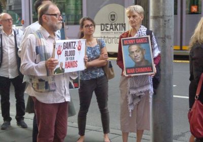 Human rights activists protested the visit to Melbourne on March 7 of Israeli war criminal Benny Gantz. “We will always live by our sword,” declared Lieutenant General Gantz on his retirement as Chief of General Staff of the Israel Occupation Forces, 12 months ago. Gantz led two major Israeli military offensives against Palestinians. Operation Protective Edge killed 2200 Palestinians, including 500 children and left tens of thousands of Gaza residents homeless. -
