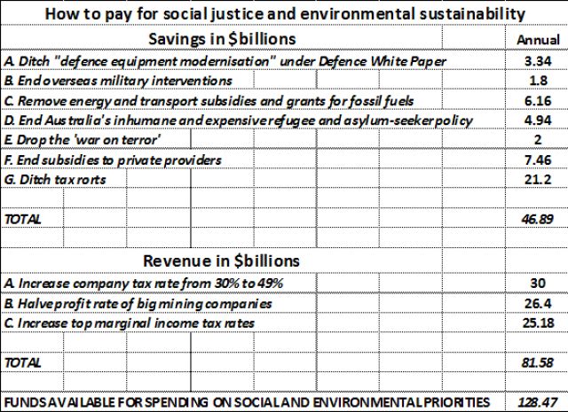 The Socialist Alliance proposals for the federal election, detailed at www.socialist-alliance.org, won’t come cheap. They include lifting welfare payments above the poverty line, ending the 200,000 public housing waiting list, achieving 100% renewable energy by 2020 through a plan of public investment, boosted public transport including inter-city high-speed rail, and closing the gap in Indigenous health, education and housing.