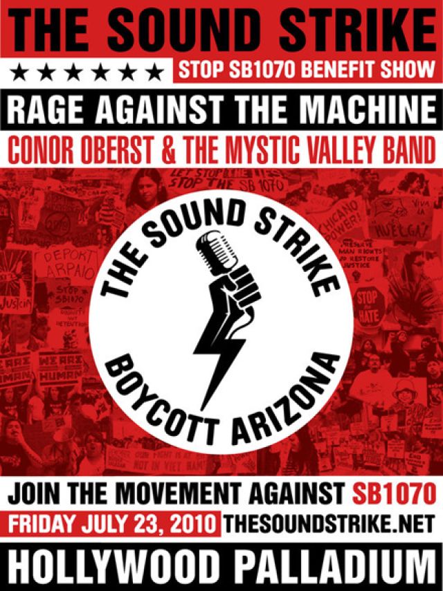 Below: Rage Against the Machine perform “Bulls on Parade” at a July 23 concern in Los Angeles in support of Sound Strike. The video includes footage from the concert at The Hollywood Palladium as well as from the civil resistance in Arizona that took place on July 29.