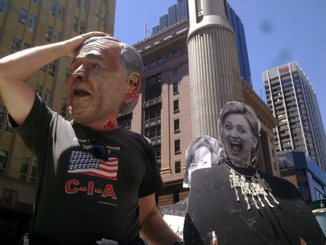 We were protesting against the AUSMIN war talks with US Secretary of Defense Robert Gates and US Secretary of State Hillary Clinton in Melbourne. Protesters threw shoes at cardboard cutouts of Gates, Clinton, PM Julia Gillard and Kevin Rudd.