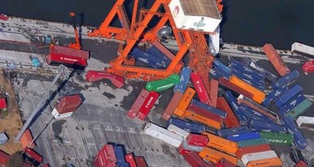 Meanwhile unions have been unable to contact some port workers at Miyako and Shiogama Sendai terminals. In Miyako both the union and company rooms have been swept away and most of the seawall is under water. In Shiogama Sendai container terminal (see photo) phones and internet are still down, the wharves are annihilated and containers scattered around the yard. The union has been unable to confirm the safety of dockworkers.