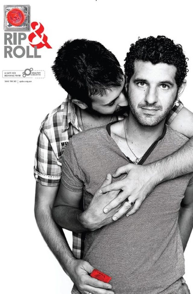 The advertisements, sponsored by the Queensland Association of Healthy Communities, depict two fully clothed gay men holding a packet of condoms while embracing each other.