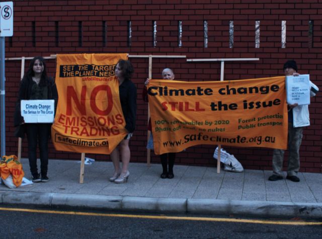 A small but spirited group of protesters braved driving wind and rain outside Fremantle’s Notre Dame University on the evening of June 30 to express their opposition to the university playing host to British climate change denier Christopher Monckton.
