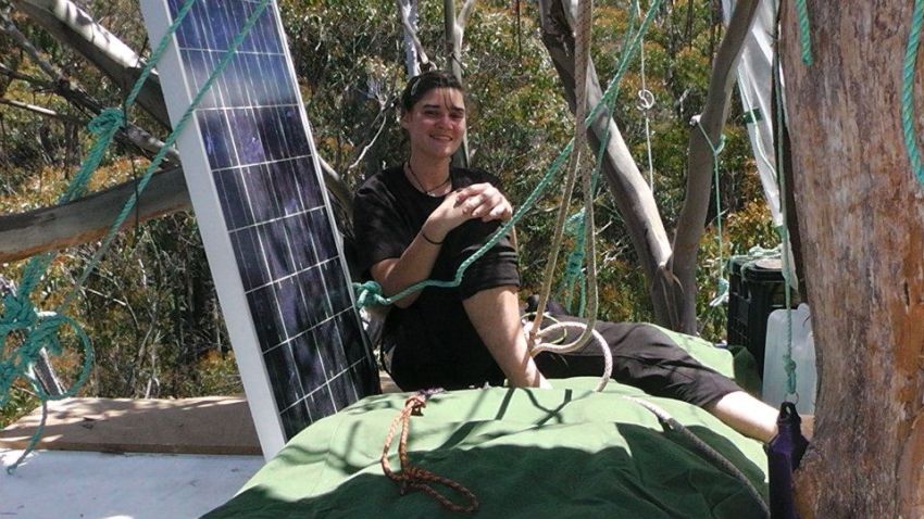Forest activist Miranda Gibson in The Observer Tree, equipped with a solar panel, computer, camera and internet access