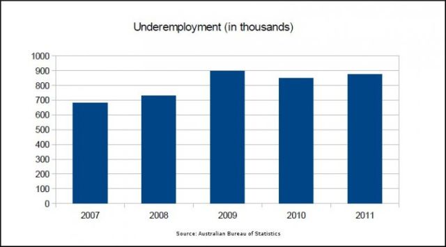 ABS estimated that late last year there were 873,500 underemployed workers — that is, part-time workers who want more hours of work or full-time workers forced to work less hours. This is in addition to the 627,500 unemployed. Since November 2007, 191,400 more Australian workers became underemployed.
