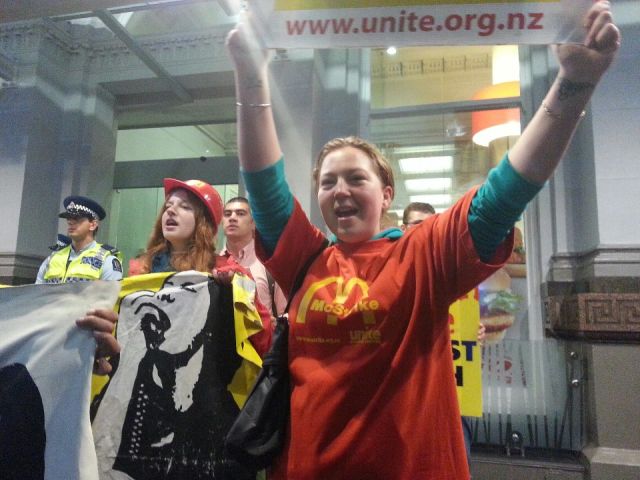 Nico said, “A brisk march up Queen street to visit other fast food outlets and to the Queen Street McDonald's” lead the police to migrate to this store and “create a physical wall of blue in front of the entrance”. Striking workers and their supporters were kept well away from the store and forced across the road. Many people were pushed and shoved by police.