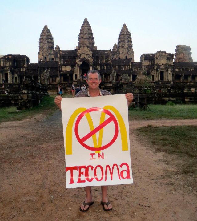 No Maccas In Tecoma is a grassroots group campaigning to stop a McDonald’s store being built in the Dandenong Ranges. Hundreds of protesters have been holding a community picket line at the construction site since July 1. Four people are occupying the roof of the building in an attempt to delay construction.