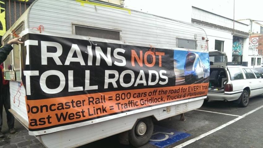 [A rally will take place at the caravan, corner of Brunswick and Westgarth streets, Fitzroy, on October 13 at 11am. To receive alerts for picket locations text “tunnel” to 0432 447 036. Sign the "No East-West tunnel pledge" at change.org. For more information or to donate to the campaign, visit EastWestTunnelPledge on Facebook.]