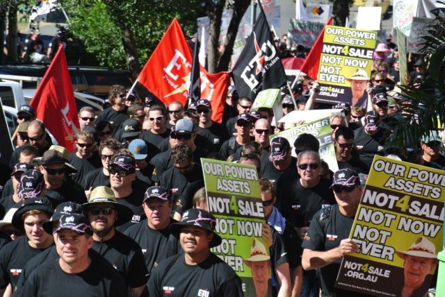 Stuart Trail from the ETU was the main speaker on the day and he spoke about the selling of the power assets and other infrastructure in Queensland. Other speakers included Peter Ong from the ETU, state secretary of the Australian Manufacturing Workers Union Rohan Webb, Michael Ravbar from the Construction Forestry Mining Energy Union, and Jason Miners from the Maritime Union of Australia. Leader of the Queensland opposition, Annastacia Palaszczuk, also made a short speech.
