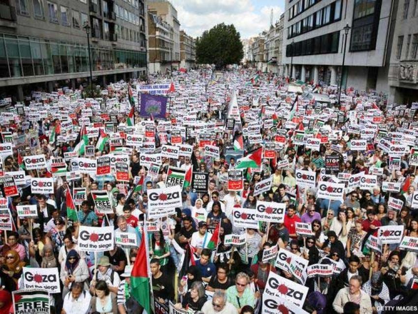 In Britain, the nation's largest-ever pro-Palestine demonstration took place in London on August 9. Stop the War Coalition said about 150,000 people marching 150,000 marched from BBC Broadcasting House to Hyde Park, passing the US Embassy on the way.