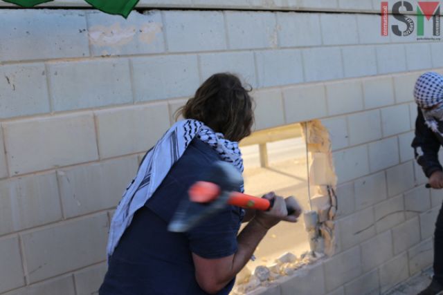 International Solidarity Movement activists and international volunteers supported the Palestinian-led action, which involved demolishing a section of the Apartheid wall using a sledge hammer and a pick-axe.