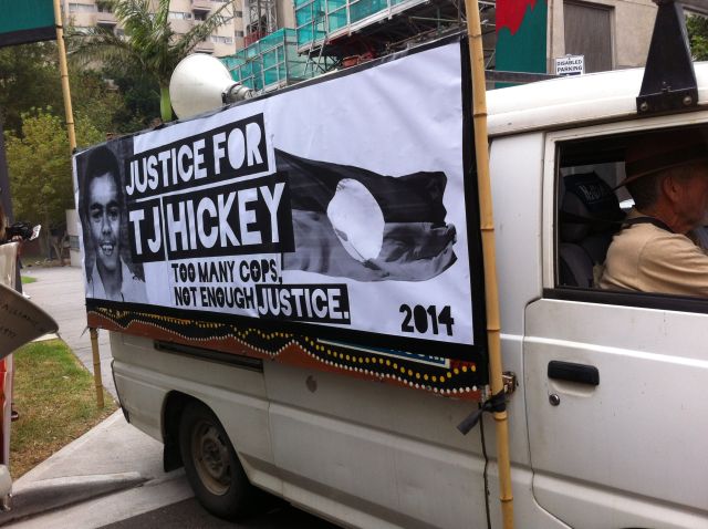 "February 14 is celebrated as a day of of love by many people, but for us it is a day of grief" said one of the Aboriginal speakers at the start of the rally and march to mark the 10th anniversary of the killing of Aboriginal youth TJ Hickey in a police pursuit in Redfern. The protest began at the spot in where TJ was impaled on a fence after being thrown off his bicycle. The Hickey family, including mother Gail, where out in force. "Its been 10 long years but I am not giving up the fight," she said.