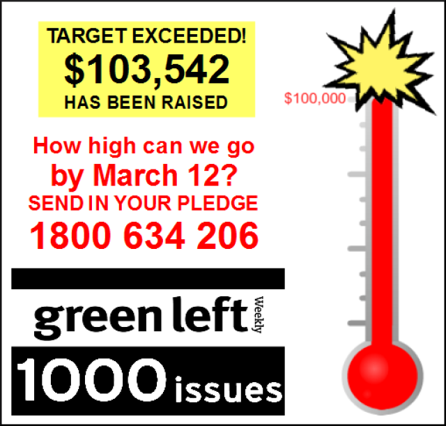 At the beginning of this year, Green Left Weekly launched a special fund appeal to mark its 1000th issue (due to be published on March 12). We set ourselves a target of $100,000 in pledges or donations by that date. The response from our readers and supporters has been fantastic and on February 20, a $1000 pledge by a longstanding subscriber and supporter took us over the line!