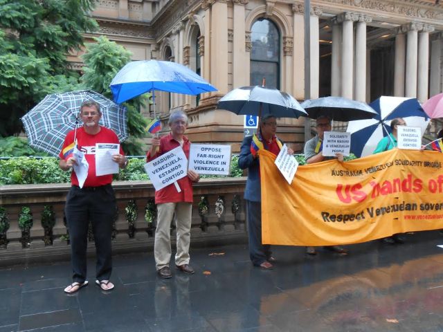 Venezuelan ambassador to Australia Nelson Davila attended the rally and said: "We thank the solidarity groups in Australia for their support. We must try to alert the people of Australia and the world because a coup plot has been activated in Venezuela, orchestrated from the US.