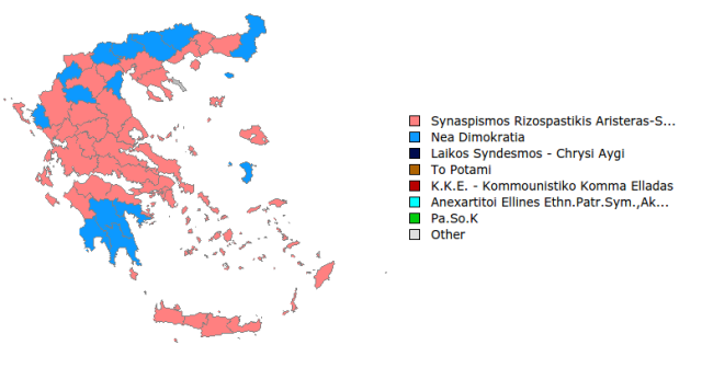 SYRIZA came first in 42 of the 56 electorates, compared with 16 in the June 2012 poll.