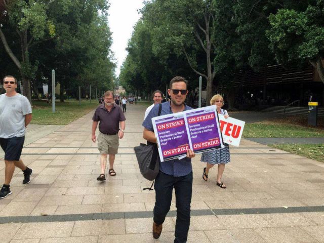 Classes were cancelled for the day and about 100 NTEU members and students picketed six gates around the campus.
