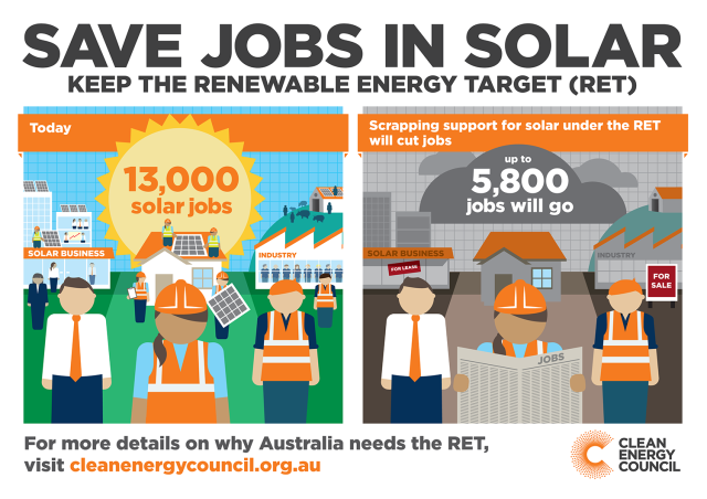 The ABS report clearly linked job losses to the RET, stating: “Policies to enable the achievement of the Renewable Energy Target (RET) have an important influence on the uptake of all types of renewable energy and therefore on employment in renewable energy activities … Uncertainty over the future of the RET, or over the size of the renewable power percentage, is likely to have a flow on effect on future investment in renewable energy infrastructure.”