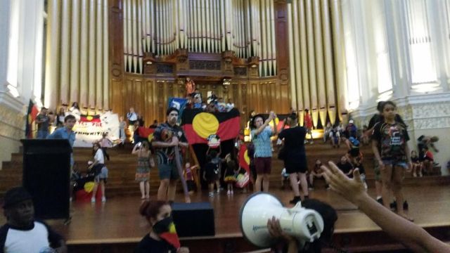 On May 2, following the rally in King George Square to oppose the forced closures of Indigenous Communities in WA, activists spontaneously marched into the Auditorium of City Hall and occupied it.