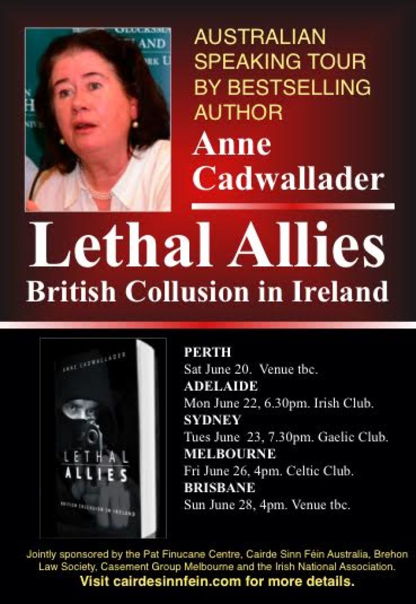 That is the unchallenged finding of 15 years of research by The Pat Finucane Centre and Justice for the Forgotten in Ireland, now chronicled in the acclaimed book Lethal Allies: British Collusion in Ireland whose author, Anne Cadwallader, is visiting Australia this month (details below).