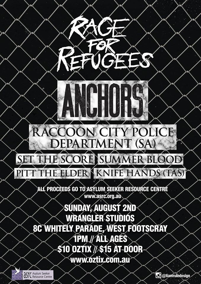 Come to Rage for refugees, a fundraiser for the Asylum Seeker Resource Centre:. Lineup: Anchors; Raccoon City Police Department; Tired Minds; Summer Blood; Pitt the Elder; Knife Hands. Tickets: $10 online; $15 at door. Sunday August 2 at 1pm. Wrangler Studios, 8C Whitely Pde, West Footscray. Tickets: visit oztix.com.au.