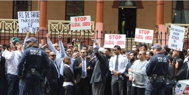 Taxi drivers and operators stopped work in major cities across Australia on September 10 in protest against Uber, which taxi drivers say is running an illegal, unregulated service.