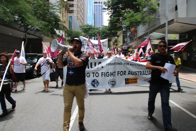 The rally began outside Brisbane's Central Station and made its way through the city to Rio's offices. CFMEU assistant state secretary Jade Ingham, Queensland Council of Unions secretary Ros McLennan, ACTU president Ged Kearney, Electrical Trades Union assistant secretary Peter Ong and sacked seafarer from the MV Portland Dale Eaton spoke to the crowd.