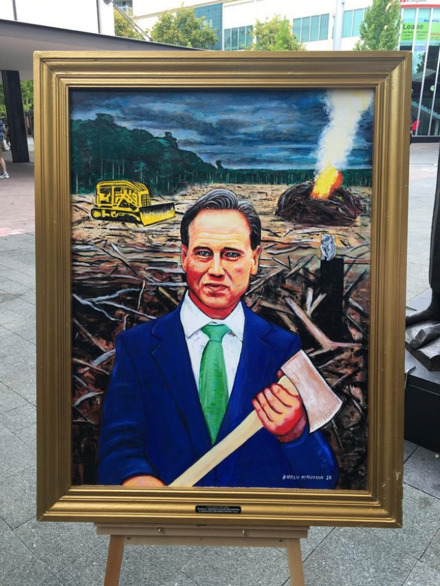 The Wilderness Society tried to deliver the painting to the minister but they were refused entry to parliament. Canberra's Portrait Gallery and the National Arboretum also rejected the painting.