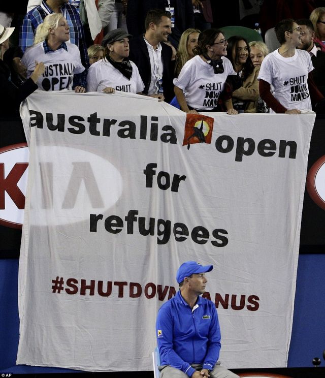 The banner read “Australia Open for refugees” with the hashtag #shutdownmanus. Morwitzer and Connors, who jumped on court, were arrested, and another four people — wearing handmade “Australia Open for Refugees” shirts — were evicted from the match.
