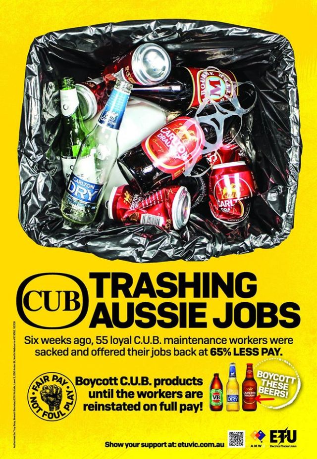 This advertisement was booked to run in Melbourne newspaper the Herald Sun, to draw attention to the plight of 55 Carlton United Brewery workers who were unfairly sacked and offered their jobs back at 65% less pay.