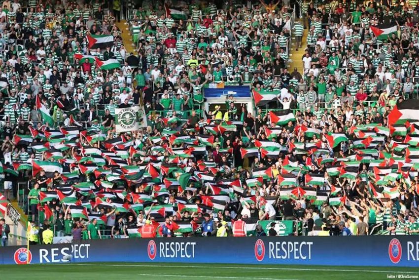 During Glasgow-based football club Celtic FC's August 17 European Champions League qualifying fixture in Glasgow against Israeli club, Hapoel Beer Sheva of Israel, Celtic supporters defied an explicit UEFA ban to fly Palestinian flags in solidarity with Palestine's struggle for freedom.