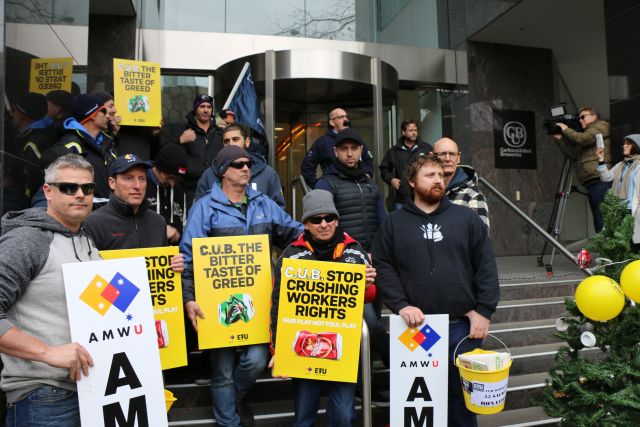 Workers at Carlton & United Breweries are showing what it takes to fight employer attacks and anti-worker laws. After having been sacked in June for refusing to accept a 65% pay cut (brought about through an act of sheer bastardry by management), the protest at the brewery's gates is growing and gathering support from across the country.