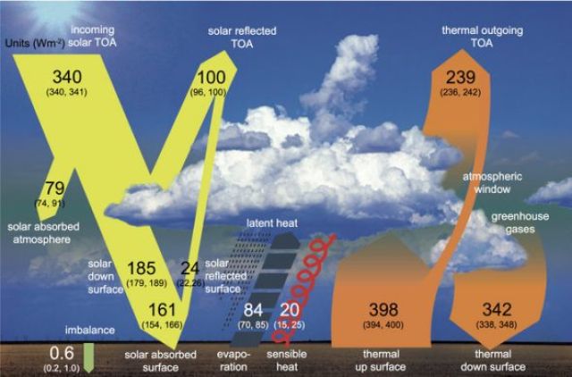 “Downward long-wave or infrared radiation from the atmosphere to the surface is a vital component to warming the Earth’s surface. The atmosphere warms the surface and cools the surface. In fact, on average through day and night and over a whole year over the whole Earth’s surface, downward infrared radiation is more important than downward solar radiation from the Sun in warming the surface.”