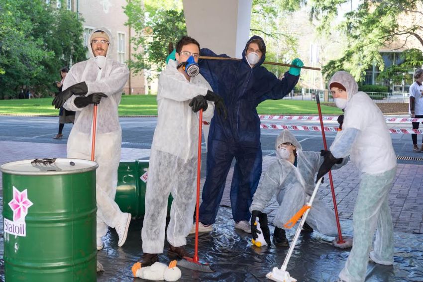 Protesters from Fossil Free Melbourne University staged a mock oil spill outside the university’s administration building on October 10.