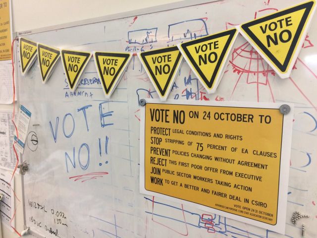 Staff of the Commonwealth Scientific and Industrial Research Organisation (CSIRO) have overwhelmingly rejected a proposed enterprise bargaining agreement that would cut workplace rights and conditions, for a pay rise well below inflation. A ballot announced on November 1 revealed that 70% of eligible staff voted against CSIRO management's proposed EBA, dealing a further setback to the Turnbull government's faltering public sector bargaining policy.
