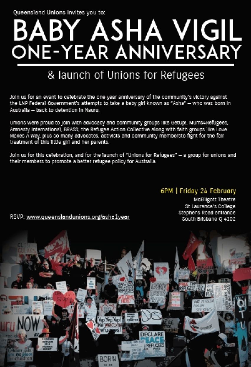 Join us for an event to celebrate the one year anniversary of the community’s victory against the LNP Federal Government’s attempts to take a baby girl known as “Asha” — who was born in Australia — back to detention in Nauru.
